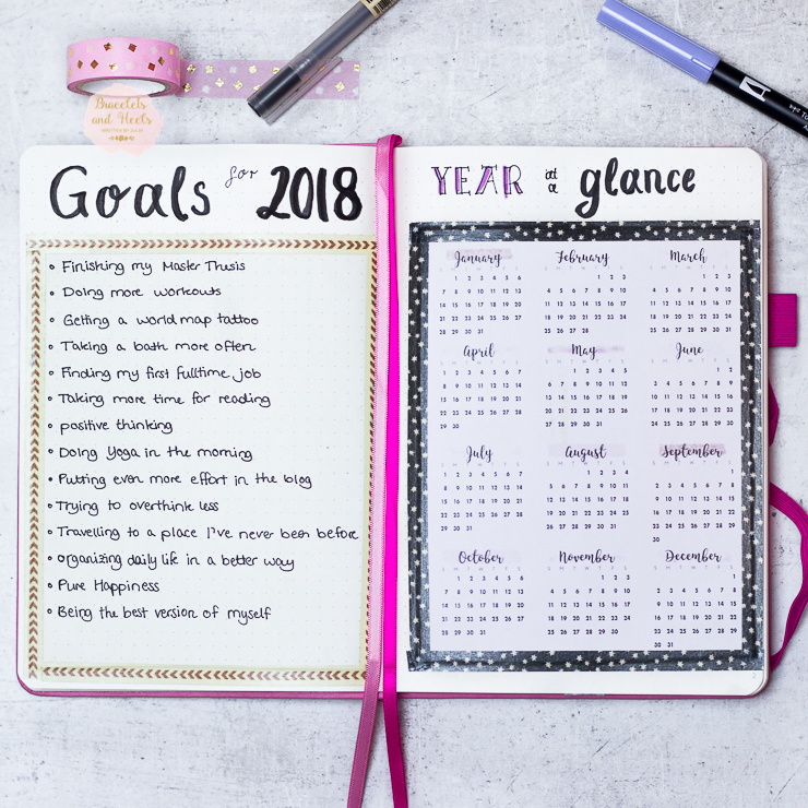 Jeden Monat begrüße ich mit einer Cover Page, die ich ein bisschen auf den jeweiligen Monat abstimme. Danach folgt eine Doppelseite, auf der ich generelle Dinge festhalten möchte. Zugegebenermaßen bin ich mit meiner aktuellen Gestaltung für Januar nicht zu 100 % zufrieden, aber es ist ja auch ein Prozess, bis man das optimale System gefunden hat.